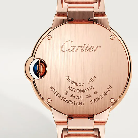 Ballon Bleu de Cartier watch. 33 mm. mechanical movement with automatic winding. Rose gold 750/1000 case and fluted crown set with a sapphire cabochon. Silvered guilloché dial. Blued-steel sword-shaped hands. Sapphire crystal. Interchangeable rose gold 750/1000 bracelet.10.16 mm thick. Water-resistant to 3 bar (approx. 30 metres).