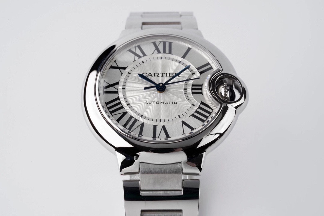 Ballon Bleu de Cartier watch. 36 mm. mechanical movement with automatic winding. Case in steel. fluted crown set with a synthetic cabochon-shaped spinel. Silvered guilloché dial. Blued-steel sword-shaped hands. Sapphire crystal. Interchangeable steel bracelet. Thickness: 12.1 mm. Water-resistant to 3 bar (approx. 30 metres).