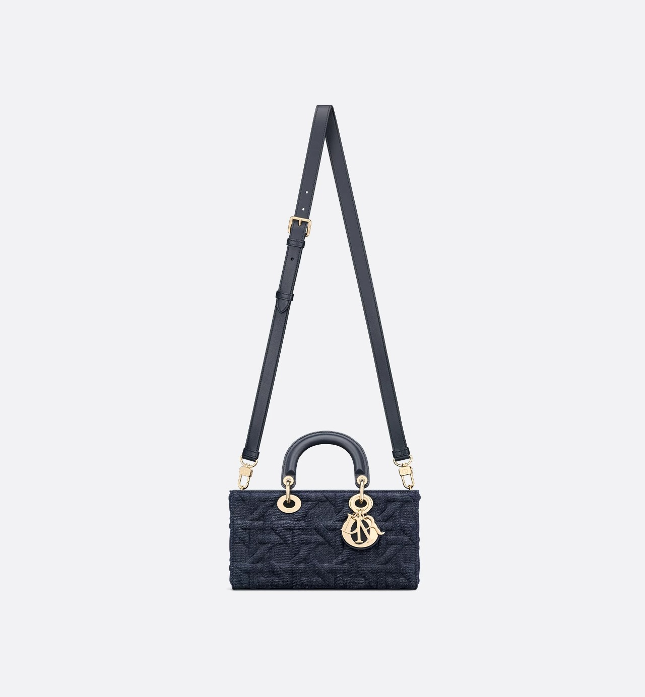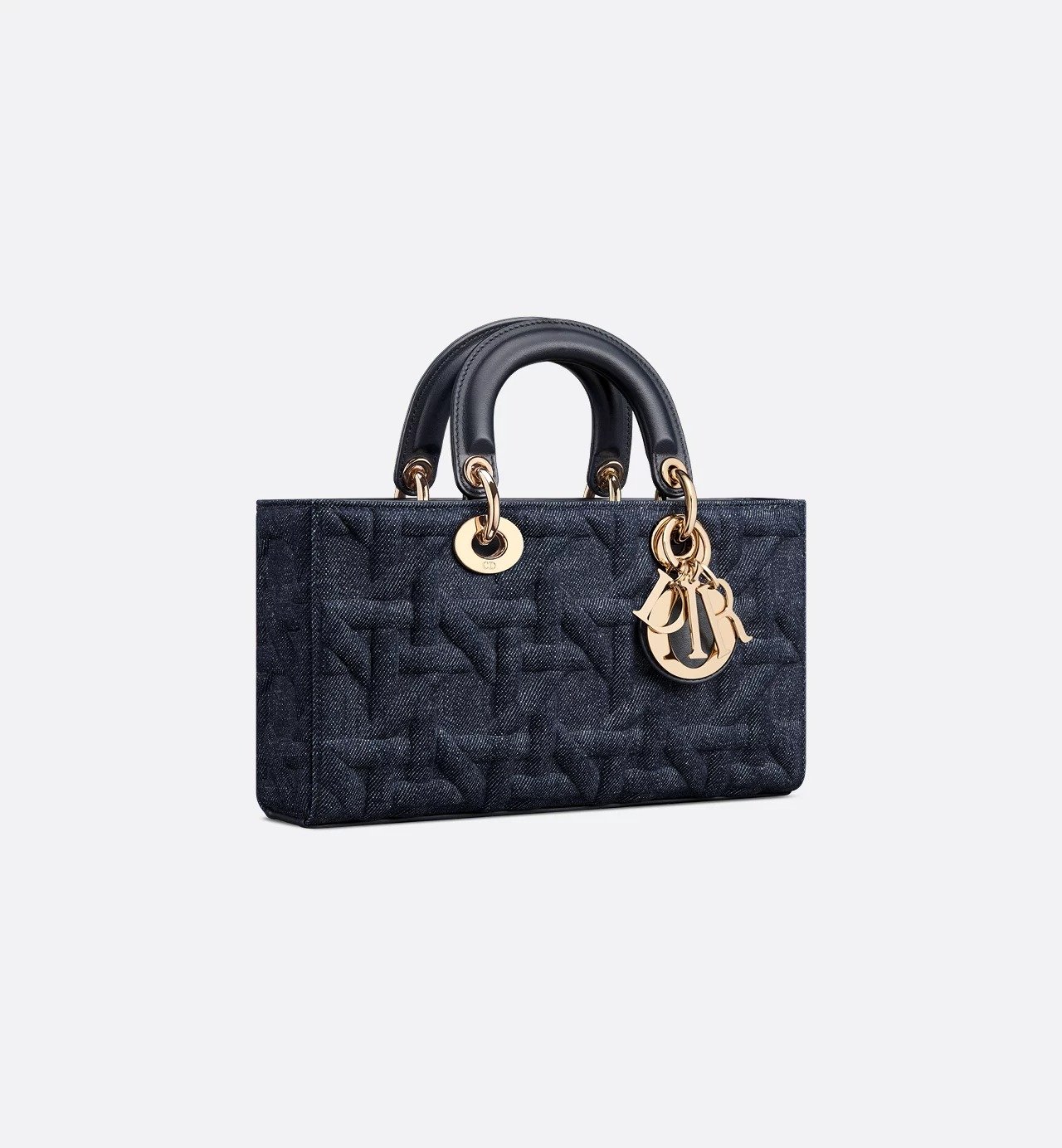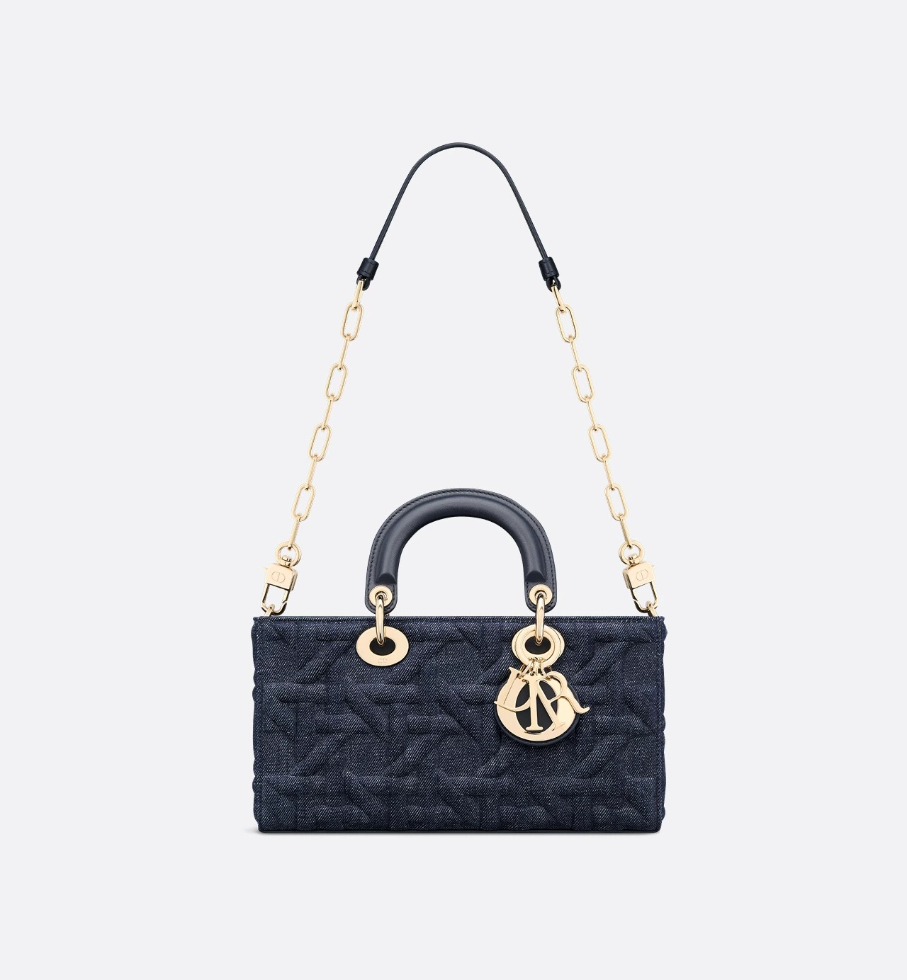 The Lady D-Joy bag captures the House’s vision of elegance and beauty by showcasing the iconic streamlined aesthetic of the Lady Dior line. Crafted in blue denim. the style features the Graphic Cannage motif. offering a modern 3D version of the House icon. Pale gold-finish metal D.I.O.R. charms embellish and illuminate its silhouette. Equipped with one removable chain strap and another adjustable and detachable leather strap. the medium Lady D-Joy bag can be carried by hand. worn over the shoulder or crossbody as a daily companion.