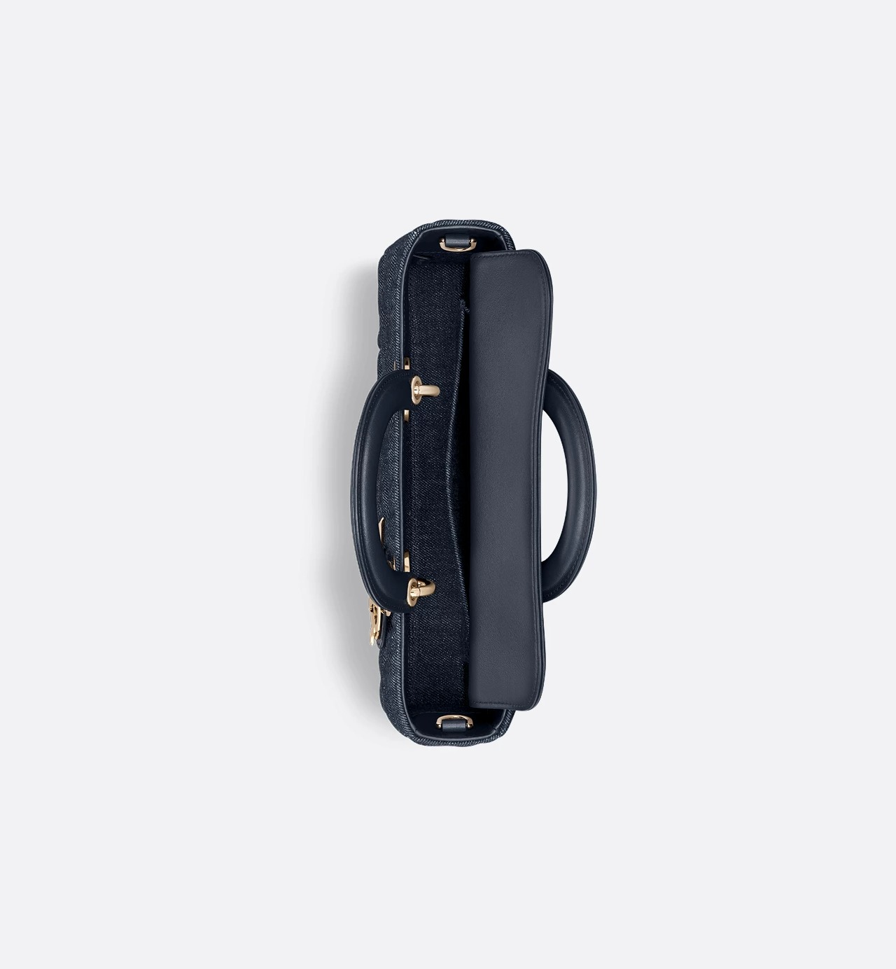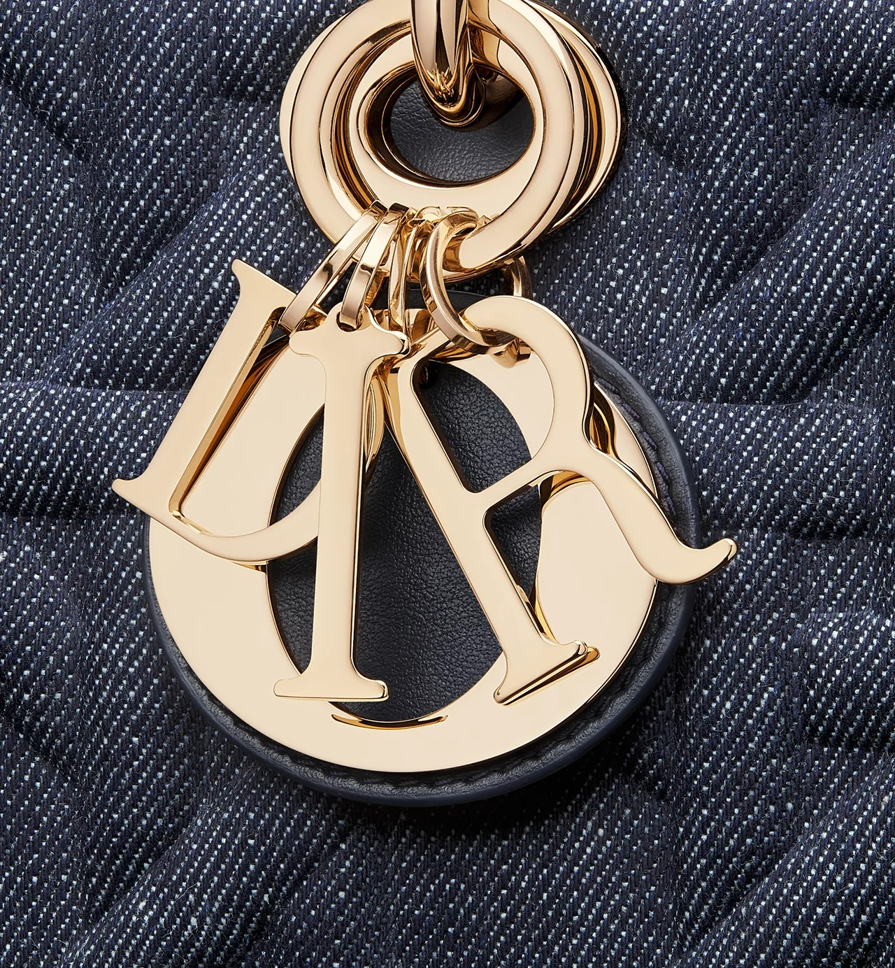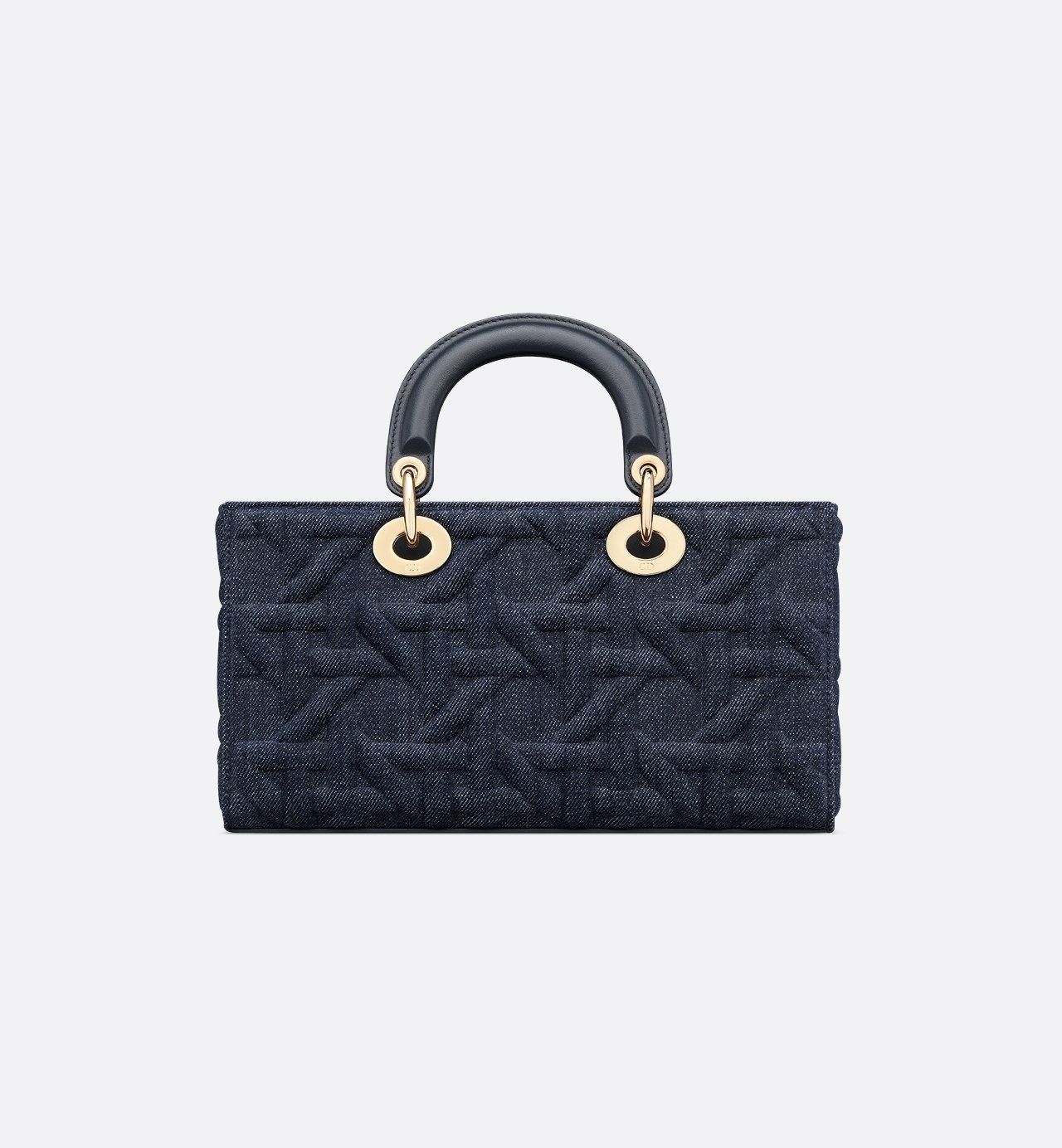 The Lady D-Joy bag captures the House’s vision of elegance and beauty by showcasing the iconic streamlined aesthetic of the Lady Dior line. Crafted in blue denim. the style features the Graphic Cannage motif. offering a modern 3D version of the House icon. Pale gold-finish metal D.I.O.R. charms embellish and illuminate its silhouette. Equipped with one removable chain strap and another adjustable and detachable leather strap. the medium Lady D-Joy bag can be carried by hand. worn over the shoulder or crossbody as a daily companion.
