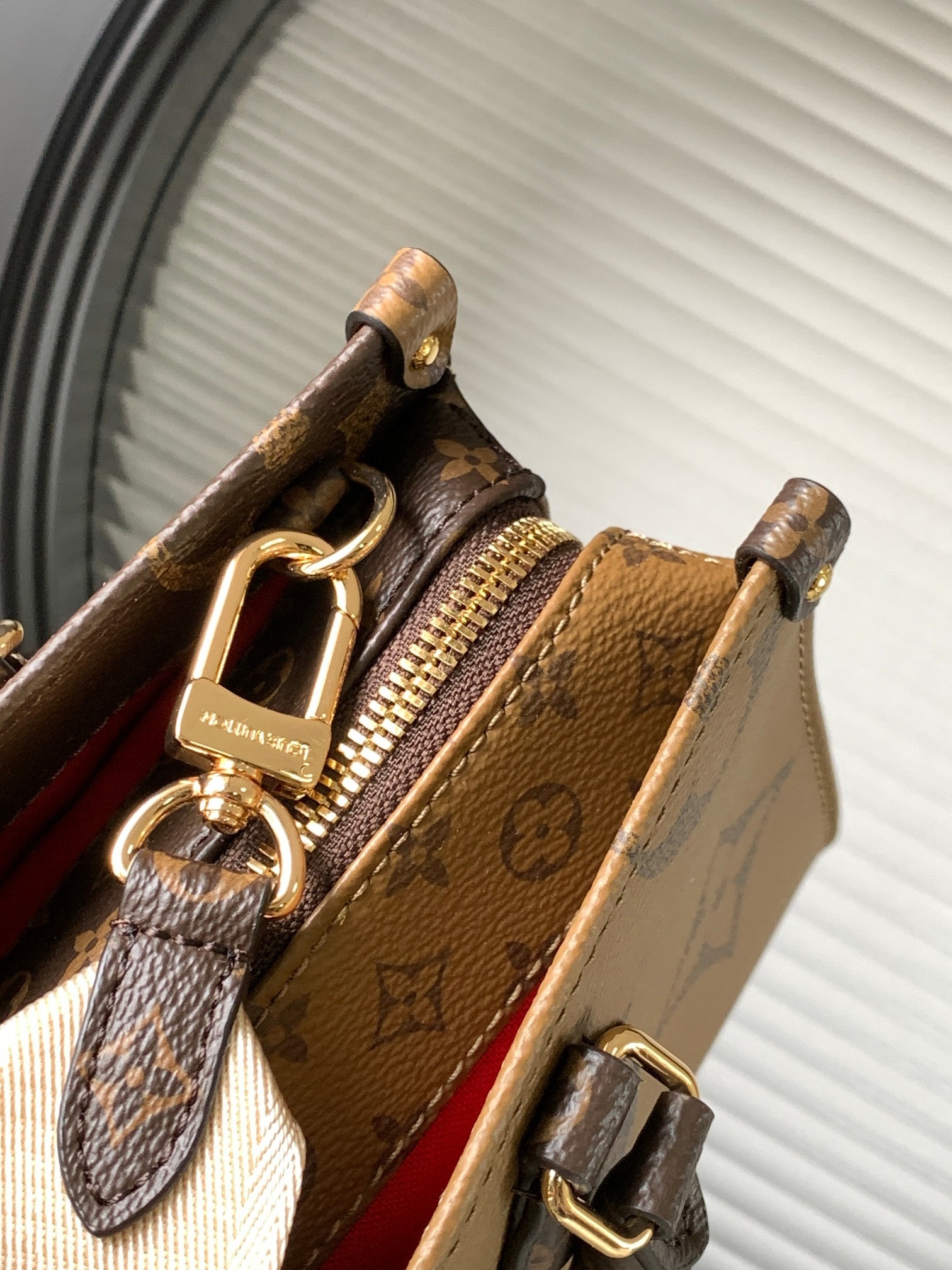 The Maison reinterprets the OnTheGo tote this season with a new east-west shape and a modern mix of Giant Monogram and Monogram Reverse canvas. Fitted with two Toron top handles and a wide. detachable strap. this beautifully proportioned bag can be styled in a variety of ways. A removable round coin purse completes this versatile design.