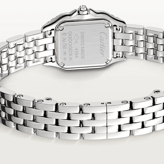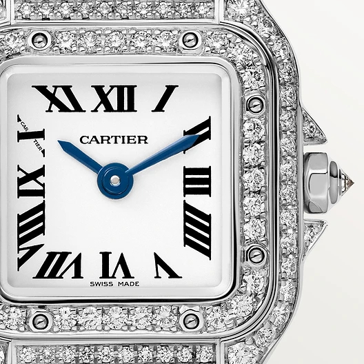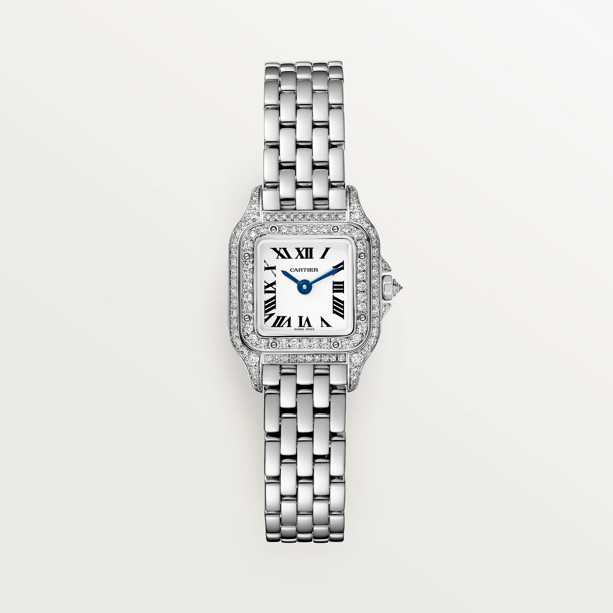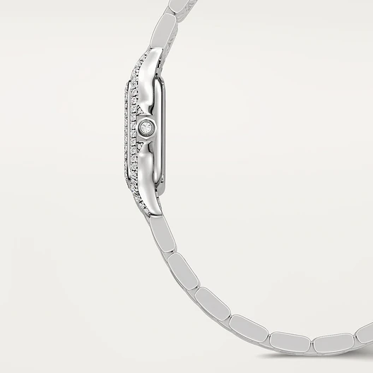 Panthère de Cartier watch. mini model. quartz movement. Rhodium-finish white gold 750/1000 case set with brilliant-cut diamonds. Rhodium-finish white gold 750/1000 octagonal crown set with a brilliant-cut diamond. Silvered dial. blued-steel sword-shaped hands. sapphire crystal. Rhodium-finish white gold 750/1000 bracelet. Dimensions: 25 mm x 20 mm. thickness: 6 mm. Water-resistant to 3 bar (approx. 30 metres). Non-contractual photo (the length of the watch strap may vary slightly).
