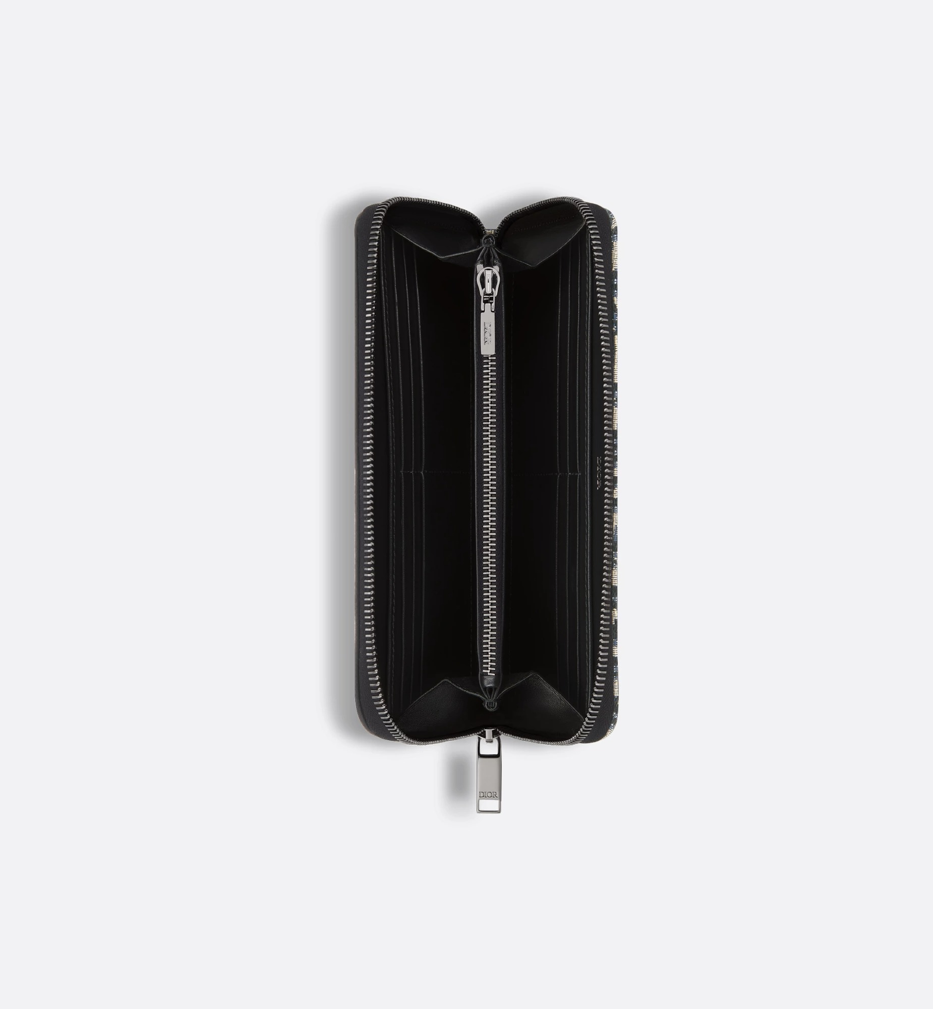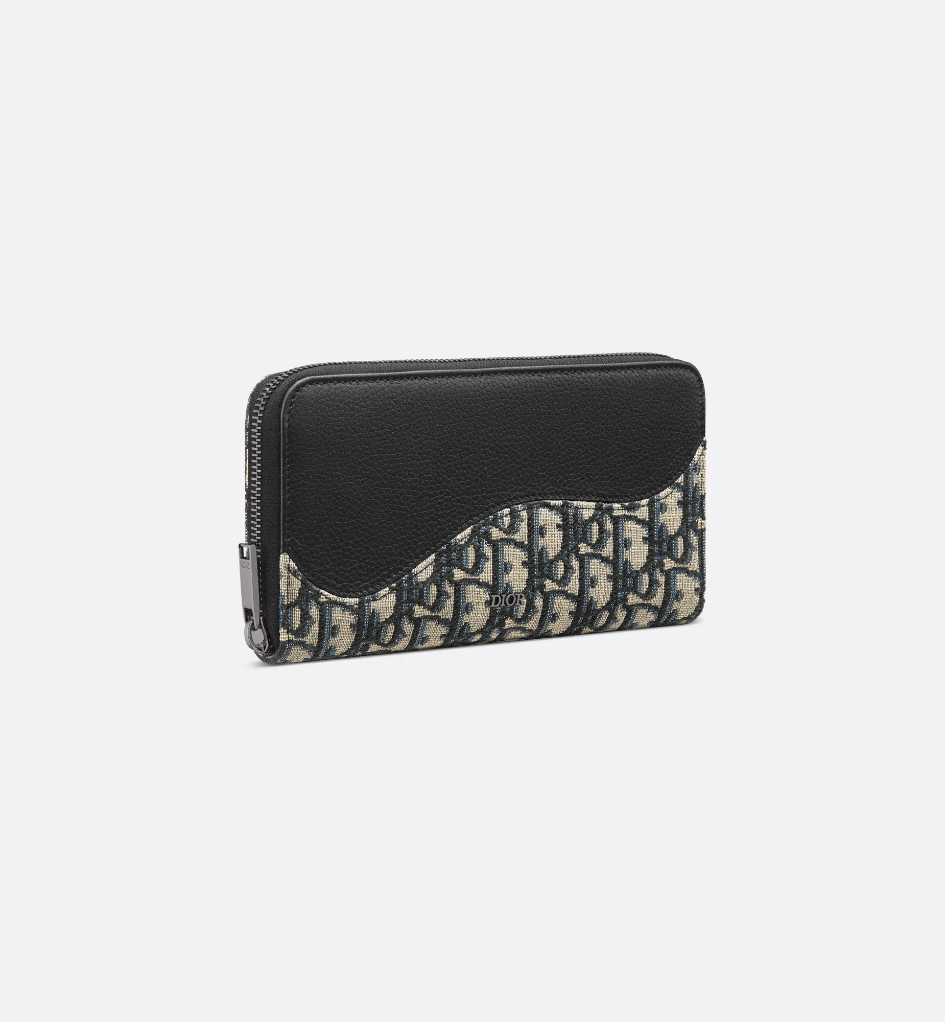 The Saddle zipped long wallet is an understated and refined accessory. Crafted in black grained calfskin marquetry with beige and black Dior Oblique jacquard. it revisits the iconic Saddle shape and showcases a Dior signature on the front. Its central zip compartment can carry coins while the double bill compartment and 12 card slots allow for optimal organization. Spacious and elegant. the zipped wallet is an ideal daily companion.