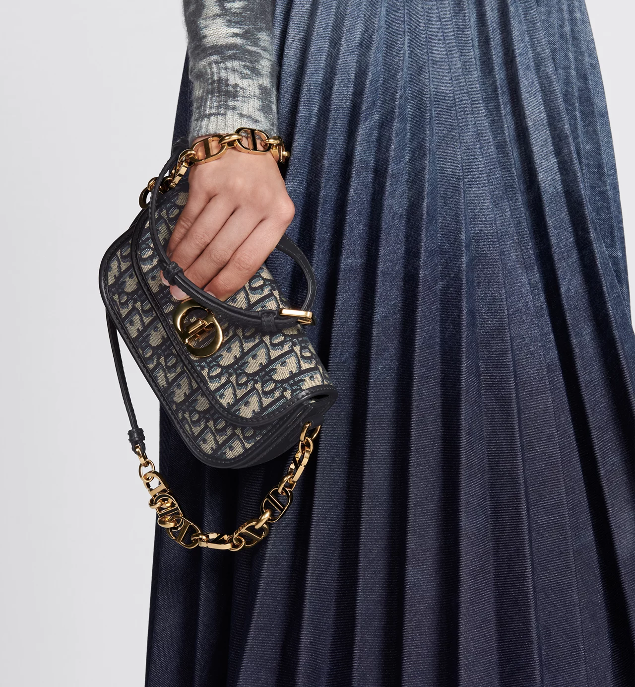 The 30 Montaigne Avenue bag enhances the hallmark line with a timeless and elegant style. Crafted in blue Dior Oblique jacquard. the rounded flap with delicate curves is punctuated by an antique gold-finish metal CD twist clasp inspired by the seal of a Christian Dior perfume bottle. The design is completed by other details. like the 30 Montaigne signature embossed on the back and the signature chain alternating gold-finish metal and enamel links. The small. gusseted bag features a refined silhouette that can be carried by hand. worn over the shoulder or crossbody.