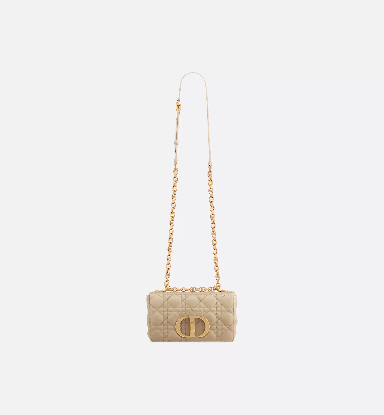The Dior Caro bag combines modernity with timeless elegance. The silhouette is crafted in stone gray calfskin with Cannage topstitching. The supple bag features a flap adorned with an antique gold-finish metal CD twist clasp. inspired by the seal of a Christian Dior perfume bottle. The detachable chain shoulder strap with CD signature links allows the small bag to be carried by hand or worn over the shoulder and may be replaced by one of the House’s wide embroidered straps for day or evening attire.