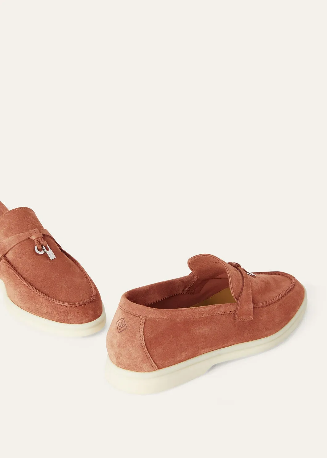 Comfortable. sporty loafers made from soft suede. They are enhanced with rubber soles — a common feature of all Loro Piana sportswear shoes. The front saddles are embellished with mini My Charms. Perfect for summers spent sailing. at the beach or in the city.