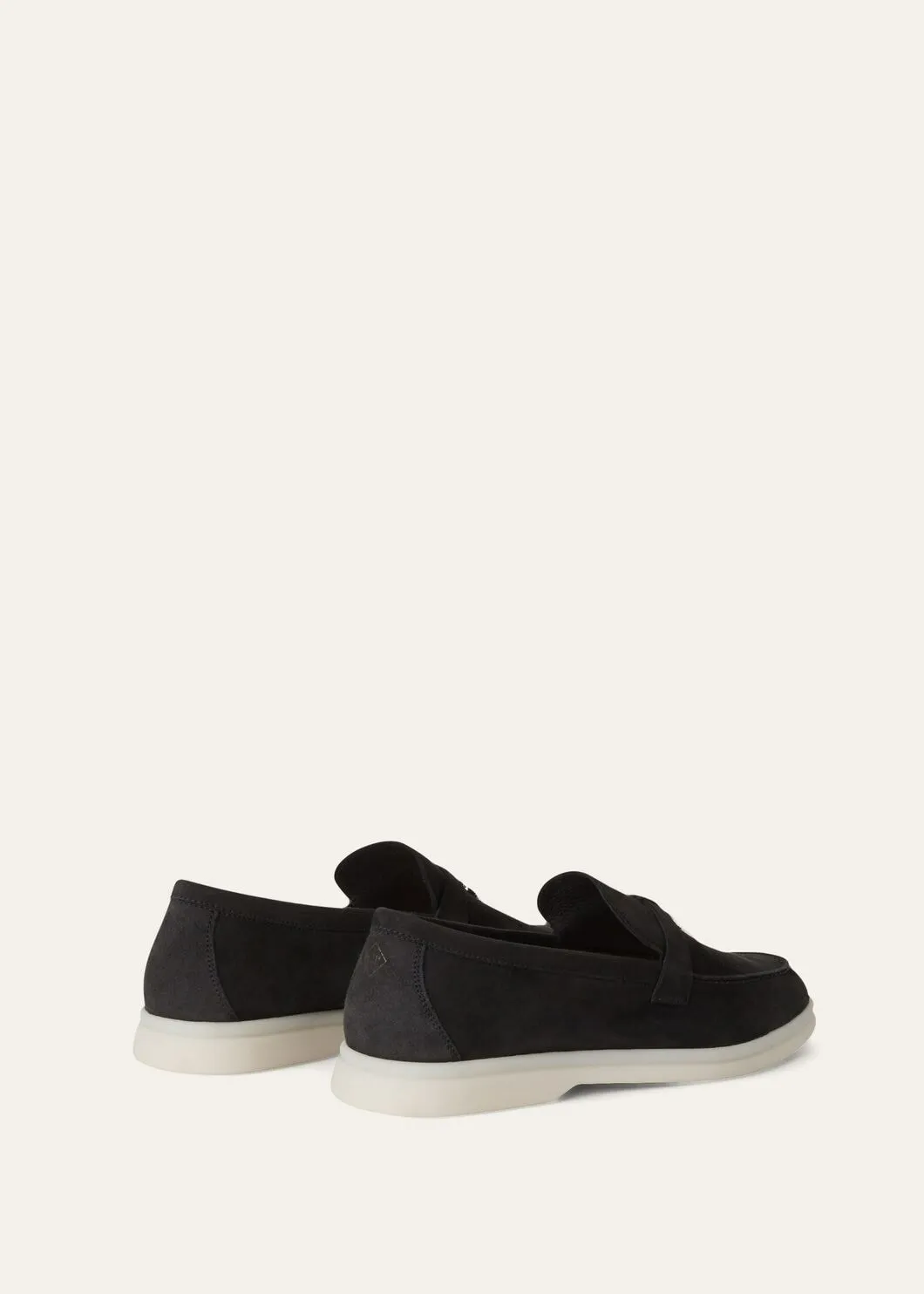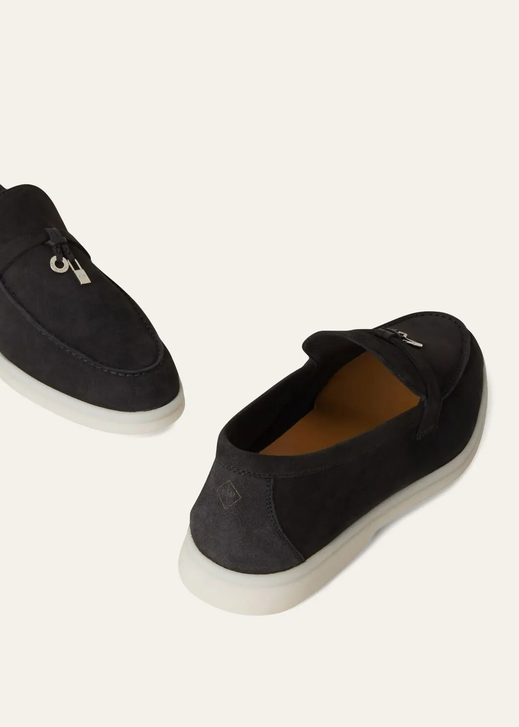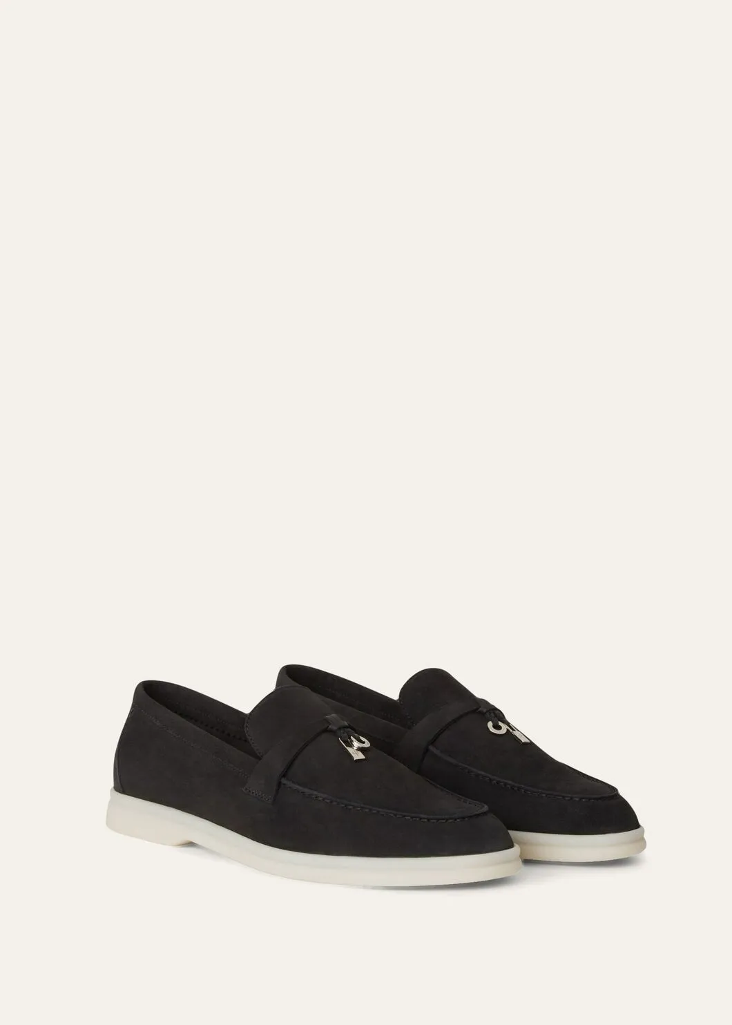 Comfortable. sporty loafers made from soft suede. They are enhanced with rubber soles — a common feature of all Loro Piana sportswear shoes. The front saddles are embellished with mini My Charms. Perfect for summers spent sailing. at the beach or in the city.