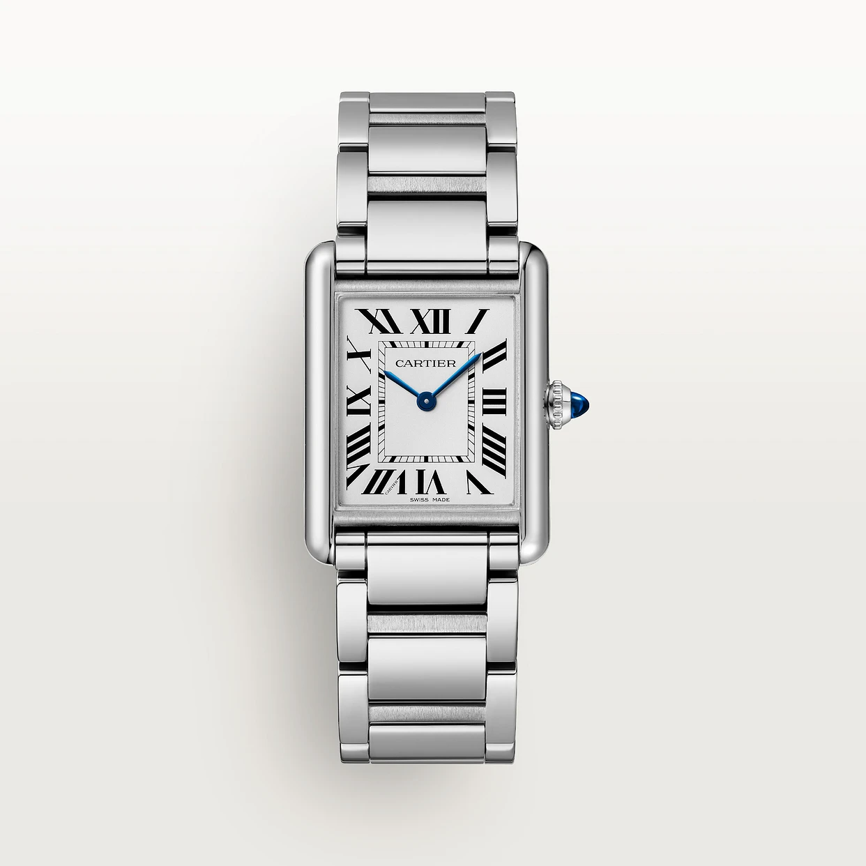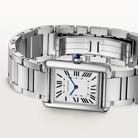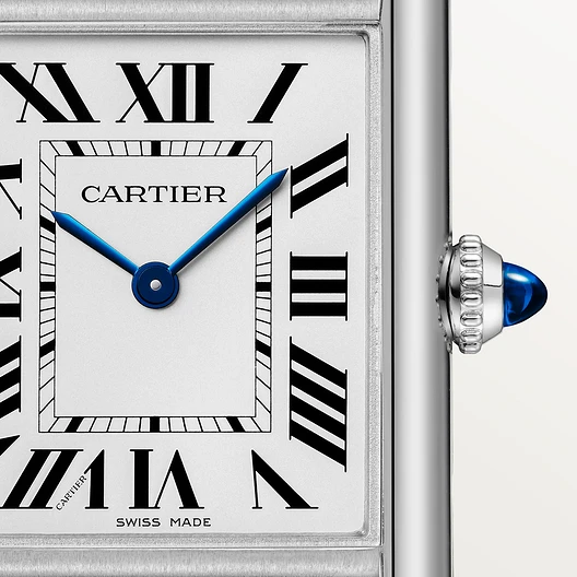 Tank Must watch. large model. photovoltaic SolarBeat™ movement. Steel case. beaded crown set with a synthetic cabochon-shaped spinel. silvered dial. blued-steel sword-shaped hands. steel bracelet. folding buckle. Case dimensions: 33.7 x 25.5 mm. thickness: 6.6 mm. Water-resistant up to 3 bar (approx. 30 metres).